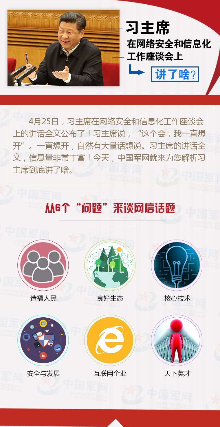 4月25日,習(xí)主席在網(wǎng)絡(luò)安全和信息化工作座談會(huì)上的講話公布了!習(xí)主席說,“這個(gè)會(huì),我一直想開”。一直想開,自然有大量話想說。習(xí)主席的講話全文,信息量非常豐富!今天,軍報(bào)帶你一圖讀懂習(xí)主席在網(wǎng)信工作座談會(huì)上的講話全文。