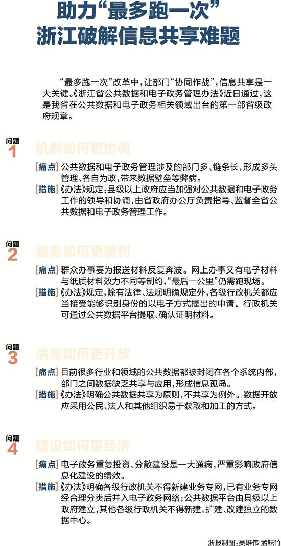 “最多跑一次”改革中,讓部門“協(xié)同作戰(zhàn)”,信息共享是一大關(guān)鍵!墩憬」矓(shù)據(jù)和電子政務(wù)管理辦法》近日通過,這是我省在公共數(shù)據(jù)和電子政務(wù)相關(guān)領(lǐng)域出臺的第一部省級政府規(guī)章。