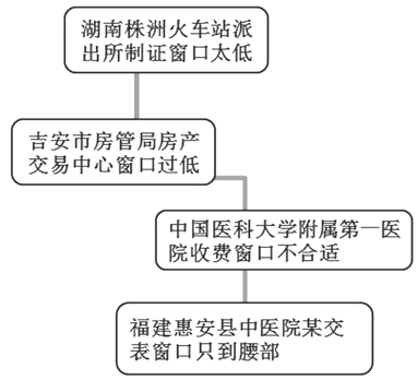 別讓窗口變“創(chuàng)口”!逗先請蟆吩u論指出,我們雖然無法揣度這類奇葩設(shè)計的本意,但寧愿相信大多數(shù)情況下設(shè)計者并無刁難群眾的主觀惡意,而只是沒有把群眾的感受放在第一位,對細(xì)節(jié)欠考量,結(jié)果讓本是便民的設(shè)施變得“坑民”。其原因歸根結(jié)底是公共服務(wù)部門宗旨觀念淡漠和服務(wù)意識淡薄。窗口讓人自然聯(lián)想到形象。所謂“窗口單位”,開了窗口也就意味著亮出了形象。從這個意義上來說,“蹲式窗口”的存在不單是損害群眾感情的傷疤,也是所在單位自損形象的“創(chuàng)口”。公共服務(wù)設(shè)施要人性化,服務(wù)部門的窗口尤其要注意細(xì)節(jié),做到以人為本。建議所有窗口單位來一次大排查、大整改,將那些不便民、不人性化的設(shè)計統(tǒng)統(tǒng)改掉。