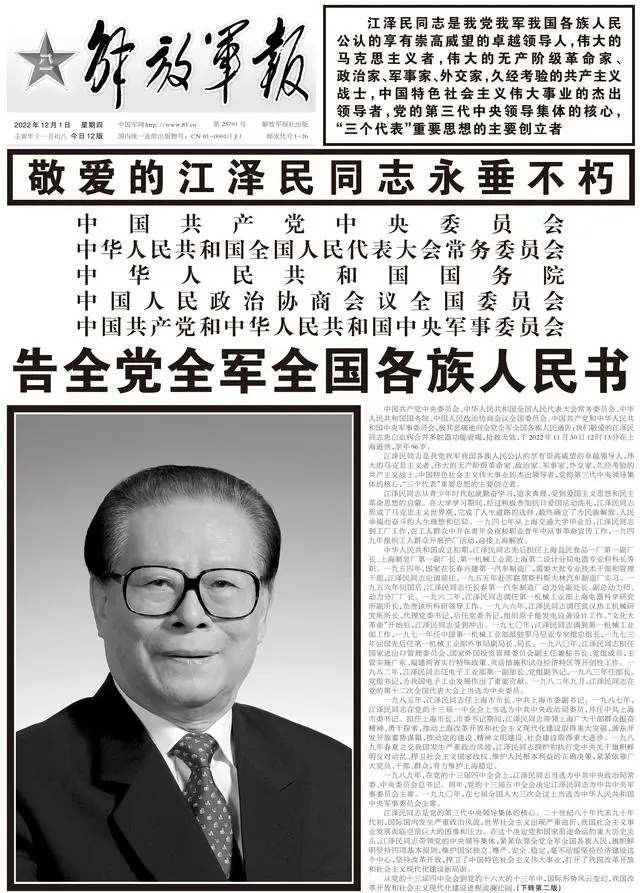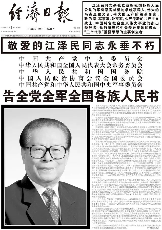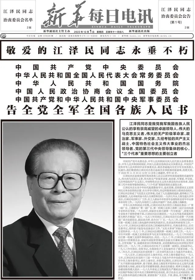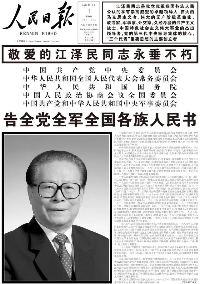 江澤民同志11月30日在上海逝世,享年96歲。12月1日出版的《人民日報》、《新華每日電訊》、《光明日報》、《解放軍報》、《中國紀(jì)檢監(jiān)察報》、《經(jīng)濟日報》等央媒在頭版集中發(fā)布告全黨全軍全國各族人民書。