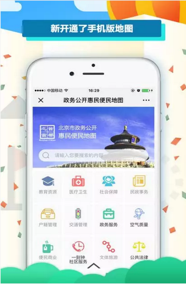 2017年,北京市政府辦公廳組織建設(shè)了政務(wù)公開惠民便民地圖,為大家提供教育、醫(yī)療、養(yǎng)老、保障房、政務(wù)服務(wù)等方面的地圖查詢服務(wù)。